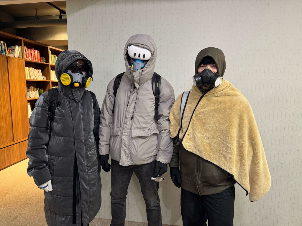 大兜:人夫失智 🐞 Feb 02, 2025 08:18AM 突然發現有這麼一張合照。公司尾牙喬裝主題是「未來」,在眾多同事爭相扮演各種賽博龐克和人工智慧的同時,我們部門團隊選擇了核戰後的未來。沒有撞主題真是太好了www(對了我是中間那一位(不重要