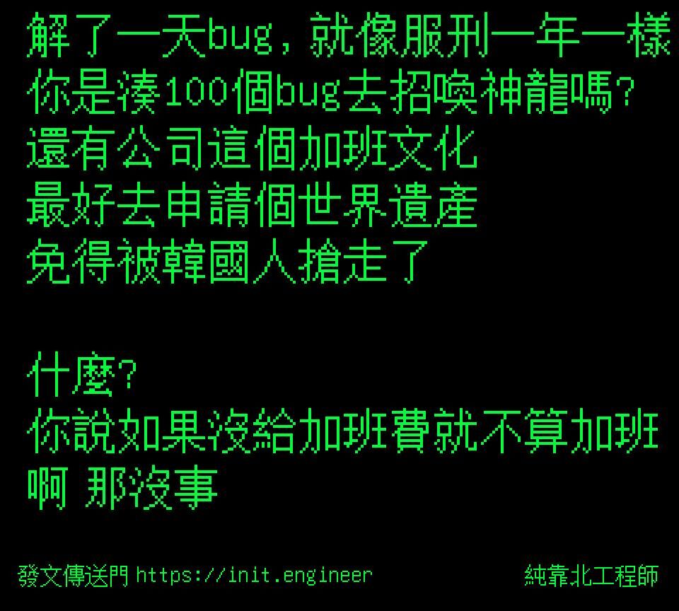 純靠北工程師 說 Oct 21, 2025 10:39AM #純靠北工程師8zj----------解了一天bug, 就像服刑一年一樣你是湊100個bug去招喚神龍嗎?還有公司這個加班文化最好去申請個世界遺產免得被韓國人搶走了什麼?你說如果沒給加班費就不算加班啊 那沒事