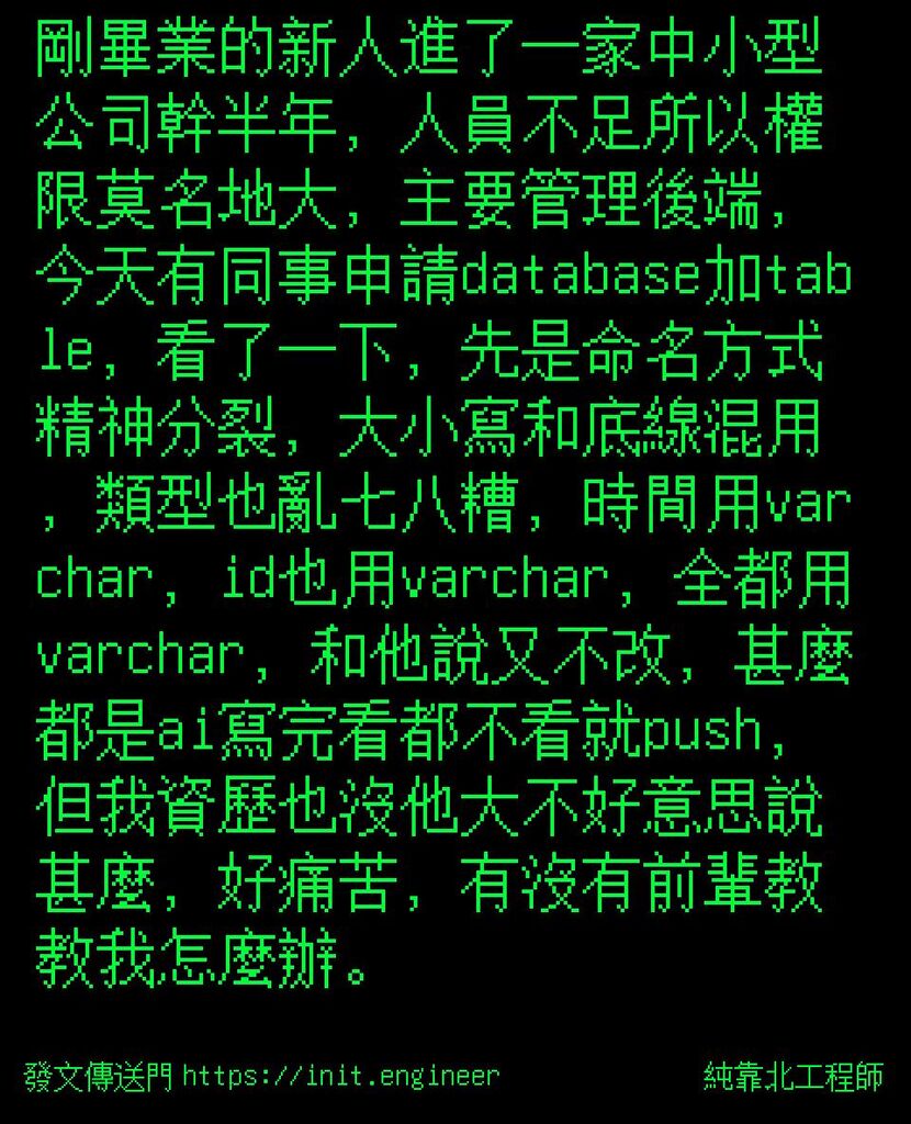 純靠北工程師 說 Oct 21, 2025 11:34AM #純靠北工程師8zk----------剛畢業的新人進了一家中小型公司幹半年,人員不足所以權限莫名地大,主要管理後端,今天有同事申請database加table,看了一下,先是命名方式精神分裂,大小寫和底線混用,類型也亂七八糟,時間用varchar,id也用varchar,全都用varchar,和他說又不改,甚麼都是ai寫完看都不看就push,但我資歷也沒他大不好意思說甚麼,好痛 ...