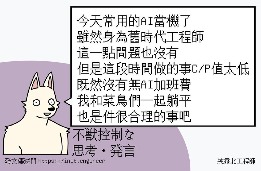 純靠北工程師 說 Oct 22, 2025 03:17AM #純靠北工程師8zi----------今天常用的AI當機了雖然身為舊時代工程師這一點問題也沒有但是這段時間做的事C/P值太低既然沒有無AI加班費我和菜鳥們一起躺平也是件很合理的事吧