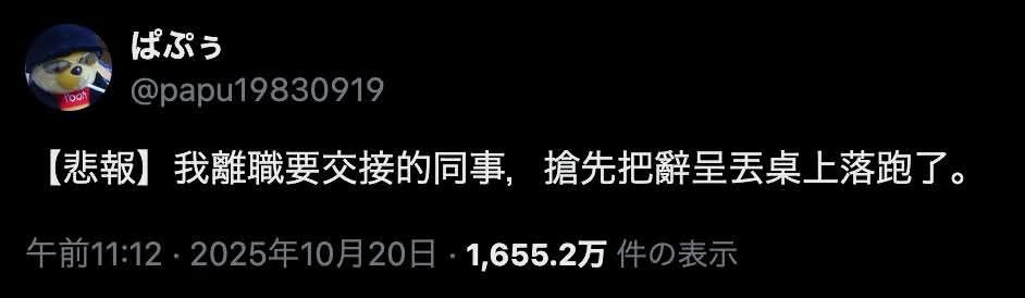 底特律仿生鴨Ann⭕icw_ㄅ Oct 22, 2025 01:17PM 新注音新聞#祥平君 on Facebook其實前一份工作有點類似一個月前就想跑了我聽到我上面的要跑大概知道會對到我雖然比他晚提但剛好我剩下的項目都完成所以比他早消失