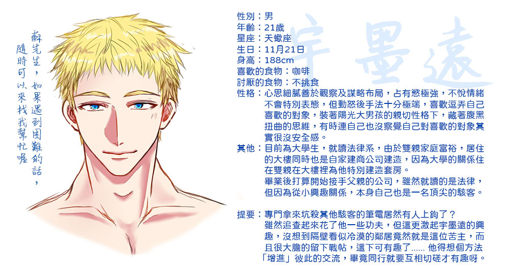舞飛音 喜歡 May 22, 2022 01:44PM #原創BL和 SixTiger 合作的原創BL小說漫畫本-請君入甕開始通販囉,庫存13本,有填印調的及試閱後有興趣的可走711賣貨便連結附上六六畫的人設(沒有收在本子內) 文案及試閱另開視窗可以再放大唷【原創BL】請君入甕(試閱) - beautywind - 原創 - Fandom [Archive o...