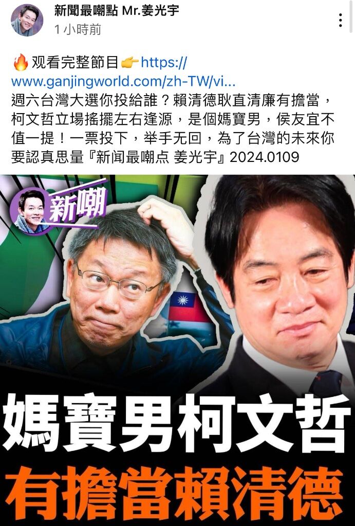 週六台灣大選你投給誰?賴清德耿直清廉有擔當,柯文哲立場搖擺左右逢源,是個媽寶男,侯友宜不值一提!一票投下...