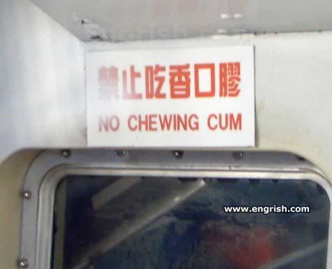 中國有個警示牌-"禁嚼口香糖" 英文翻成: "No Chewing Cum" (請勿嚼屄 或 請勿嚼 xiao) LOL