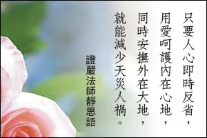 只要人心即時反省,用愛呵護內在心地,同時安撫外在大地,就能減少天災人禍。 每日靜思語圖案 :