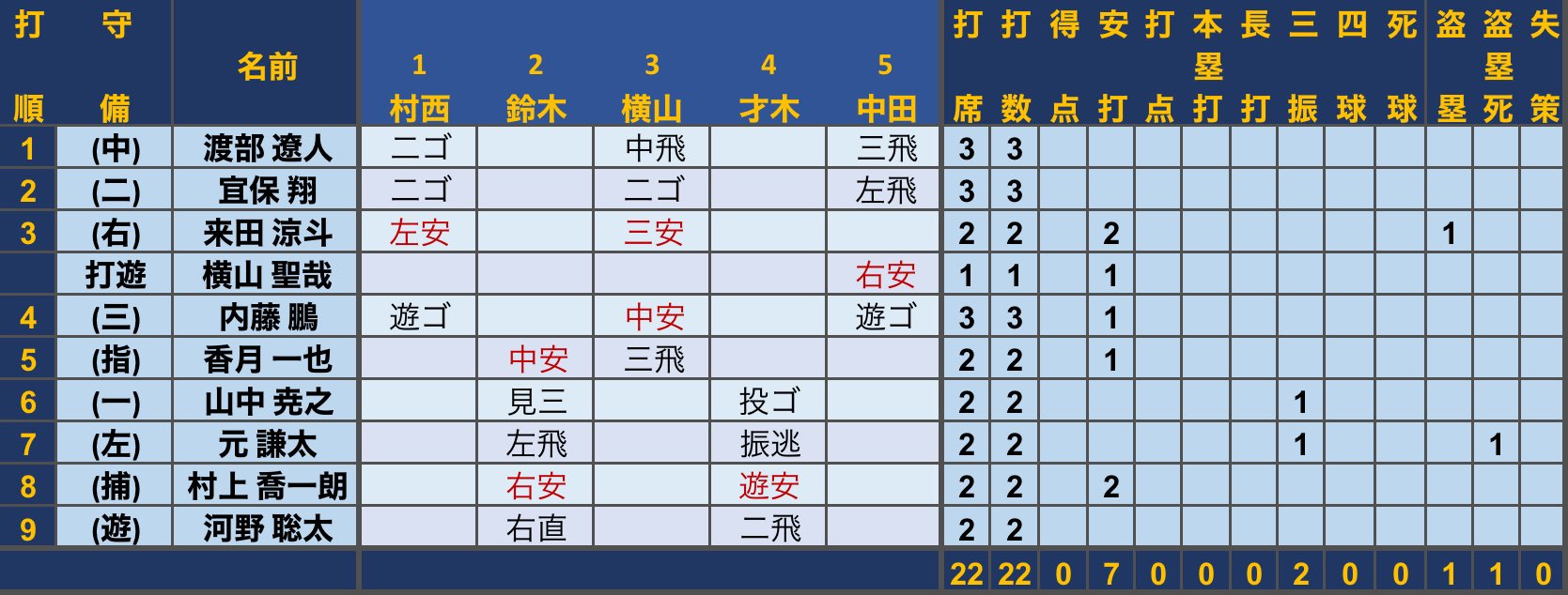 小田西野,兩人都是右投左打加最喜歡這種特殊沙包、尤其西野。G2 看到右投直接讓西野上陣帶起順風,G7 反而卻因傷員堅持上場(杉本的傷需做手術這點圭太曾表示「感受到前輩的覺悟」,推測野手陣全員知情)加對對面球隊的負面思考而影響決策,太可惜了。