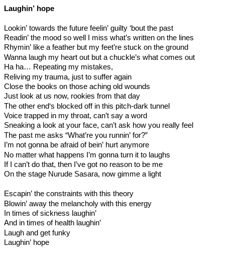 Tragic Transistor 是介紹大阪division 隊長的歌,Comedian Rhapsody 是描寫搞笑藝人站在台上的心情,這首Laughin' hope 則是更多的描寫 Tragic Comedy 的 'tragic' 一面,並帶出笑之於簓的意義。