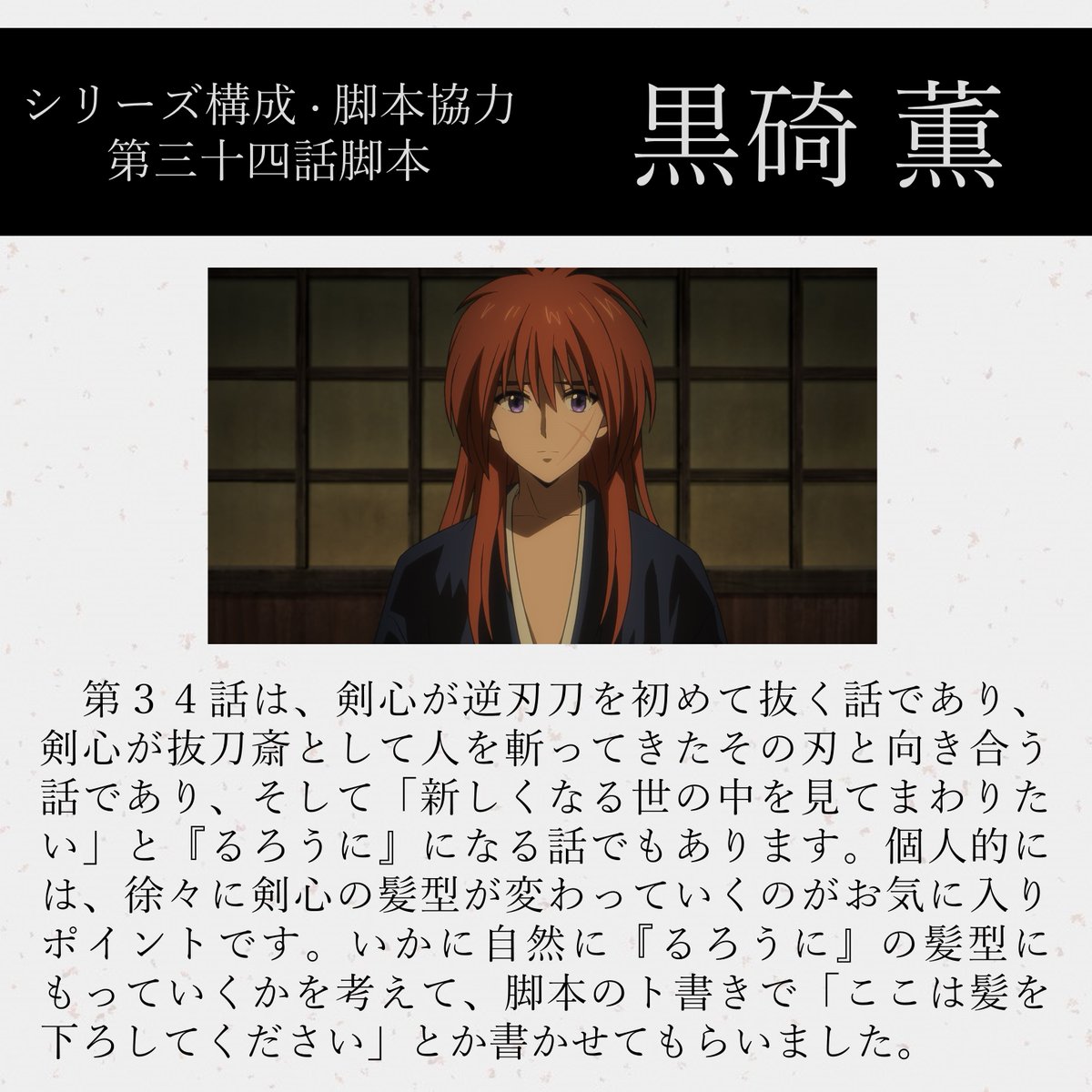 黒碕薫🌼 (@kaworu963) on XTVアニメ『るろうに剣心-明治剣客浪漫譚-』第31話〜第34話、脚本として参加させていただきました。