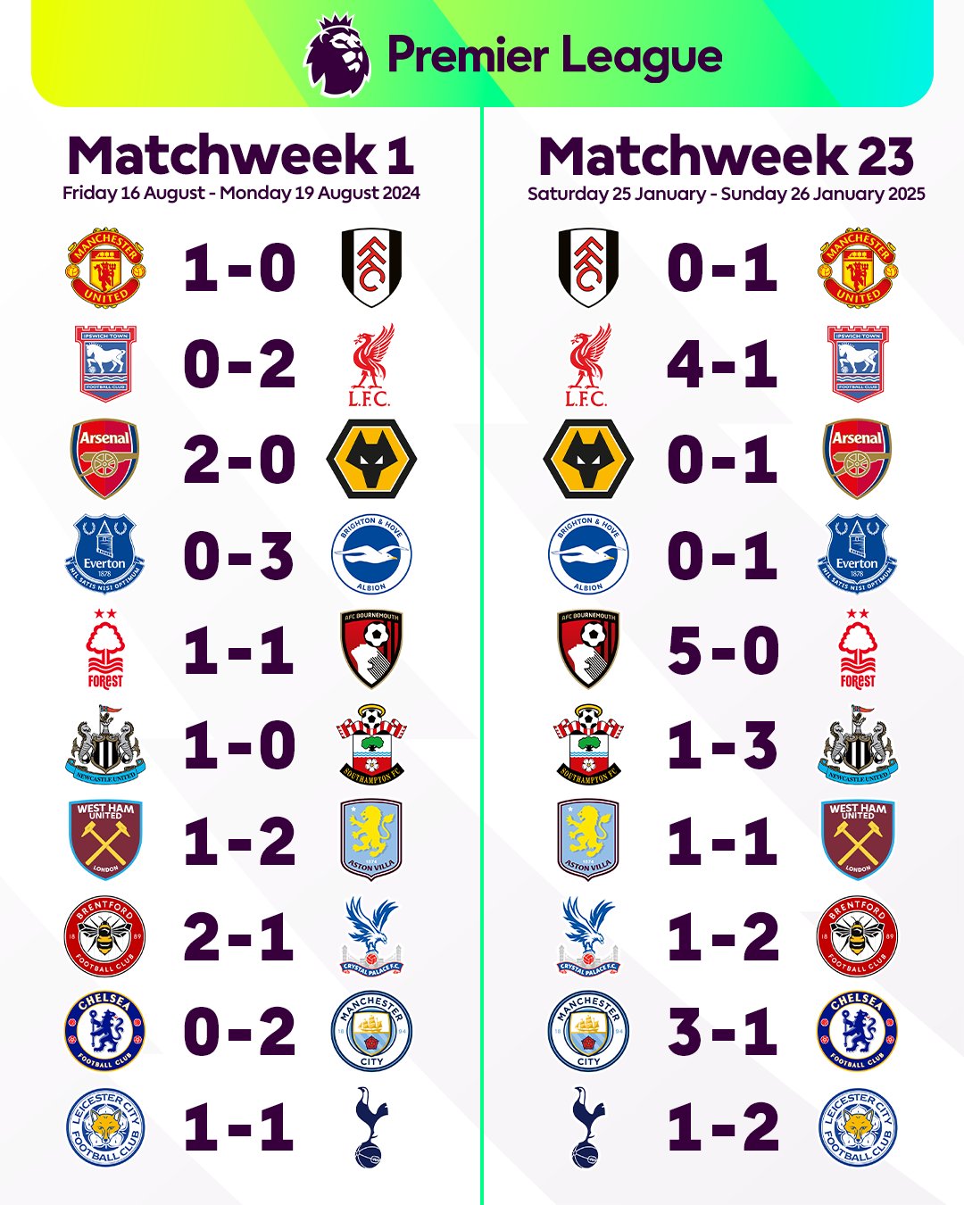 Premier League (@premierleague) on XWith Matchweek 23's fixtures being repeats of this season's opening weekend, take a look at how the results compared ⬇️