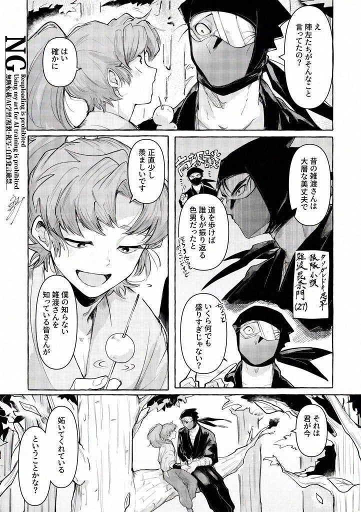 「雜渡昆奈門先生稱讚我的時候,也會這樣稱讚您身邊的、ㄌ、......嗎?」那個單字伊作語焉不詳、胡亂帶過,雜渡卻聽得一清二楚,完全明白伊作今日待他的表現為何如此躊躇不決。