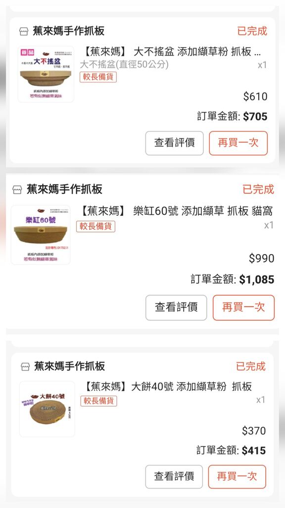 另外要大推特推的貓抓窩/板也是蝦皮上的叫做蕉來媽手作抓板,他是真的真的非常耐抓也不掉屑,我回購很多次了,非常推薦!