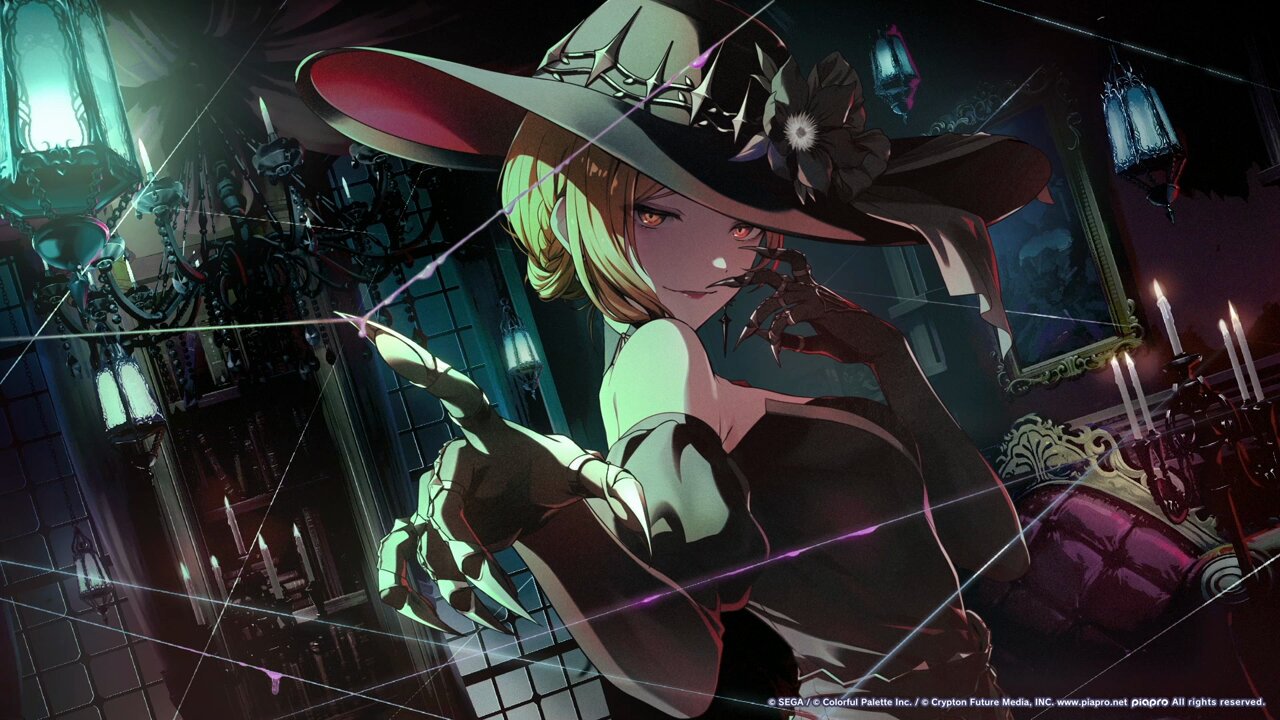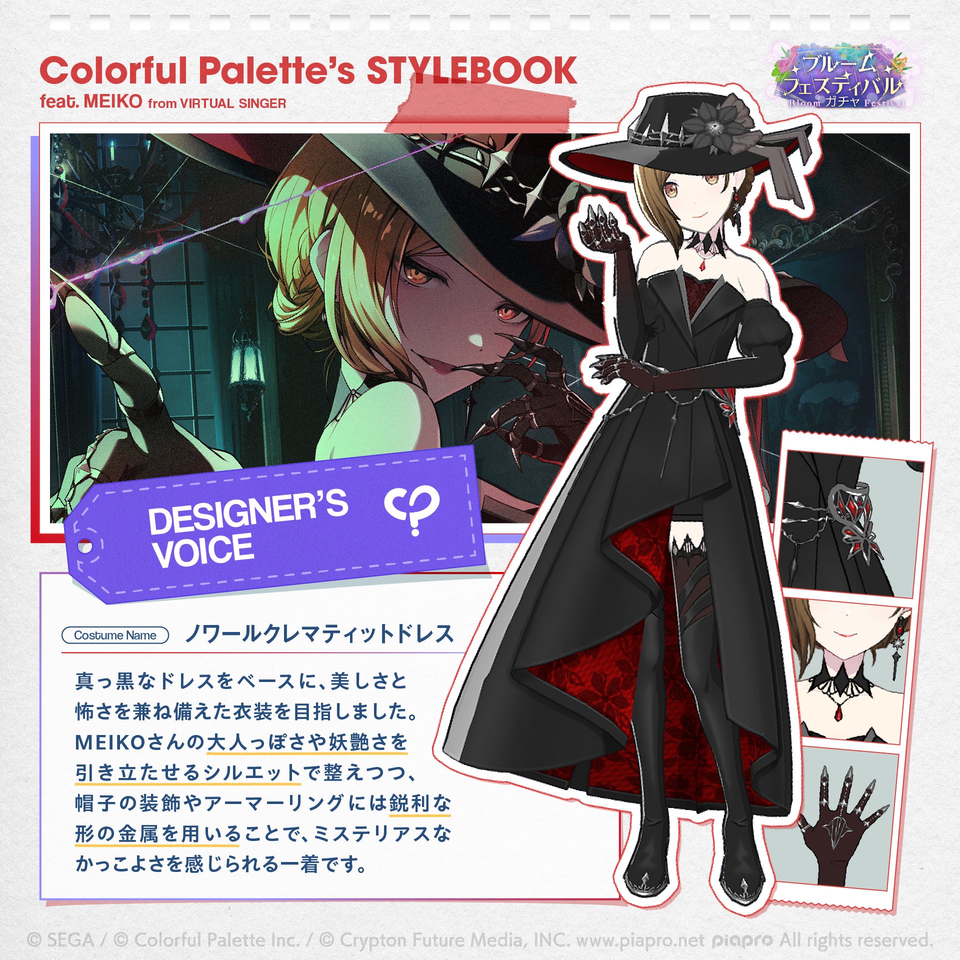 株式会社Colorful Palette(カラフルパレット) (@CP_inc_official) on...一襲黑色禮服套裝,兼具美感與恐怖,襯托出MEIKO成熟美艷的形象,再利用銳利形狀的金屬製作帽子上的裝飾與Ring Armour(騎士裝甲)意圖使人感受到神祕及帥氣。