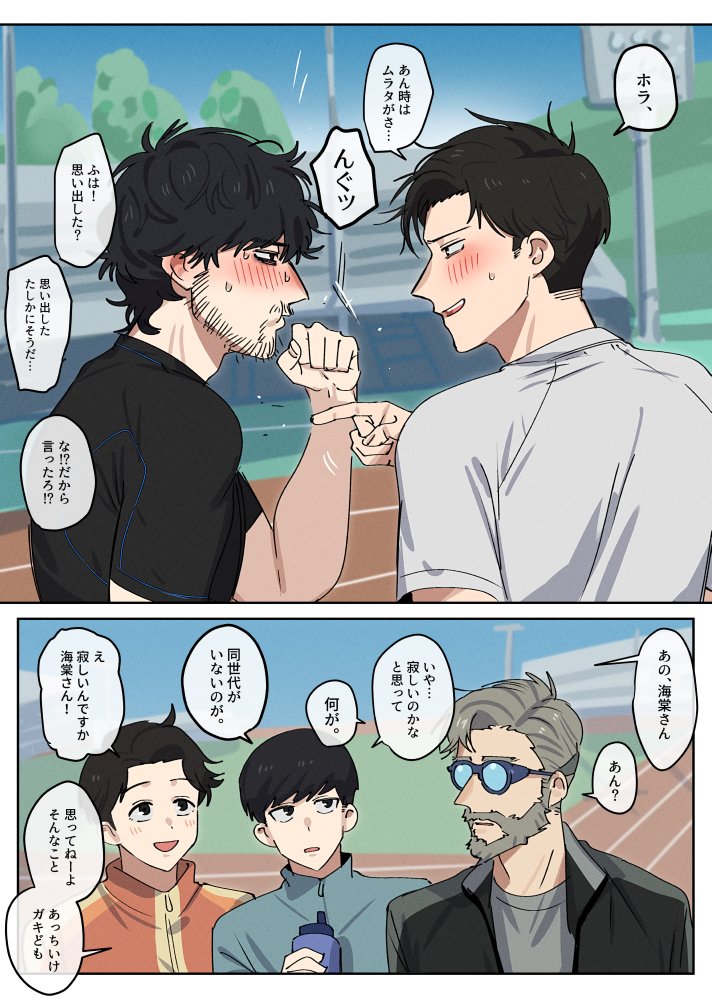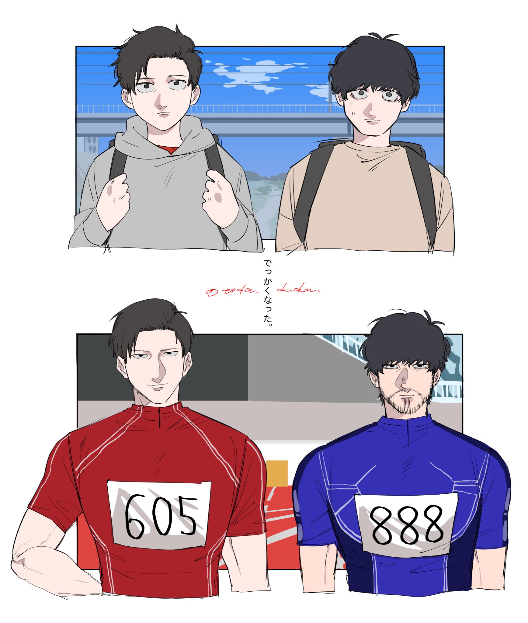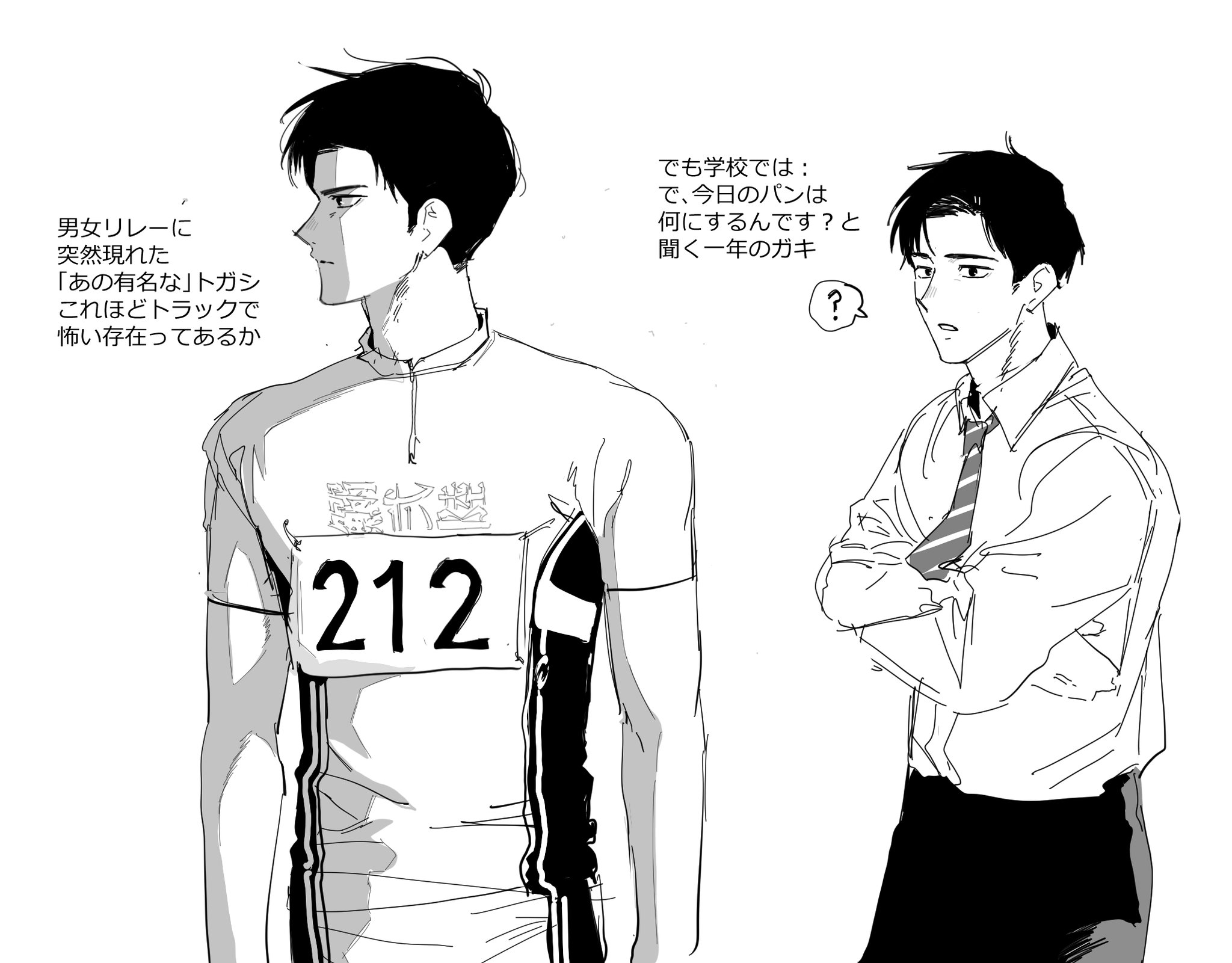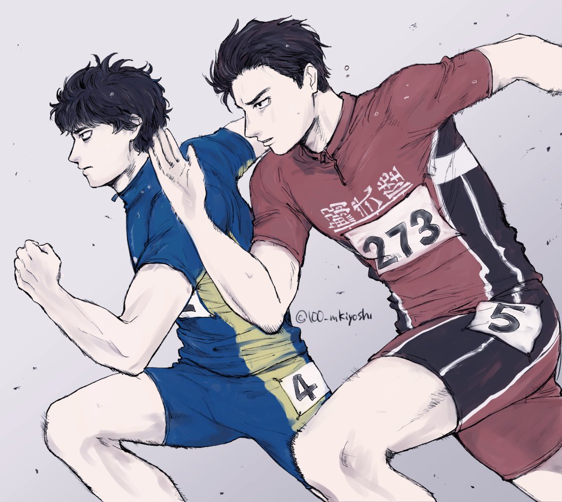 一直在想沒受傷的情況下,兩人間到底是誰會先引退🤔個人覺得是小宮,因為劇中不只一次提到小宮的姿勢很胡來,跟堪稱田徑模範生的トガシ相比,他的跑姿應該蠻亂七八糟的,但鑑於肉體夠健壯所以速度催的上去(毫無根據)。我猜小宮應該跟大谷一樣屬於只能欣賞不能模仿的類型,而這樣的跑法多少會對身體造成傷害吧?所以我覺得他會先トガシ一步引退。不過在日本選手權過後トガシ一定會時常跟他一起跑步,發現他的姿勢可能傷到肌肉之後就會出言提醒,於是小宮就這樣獲得了一名貼身訓練員(