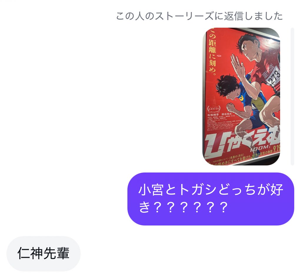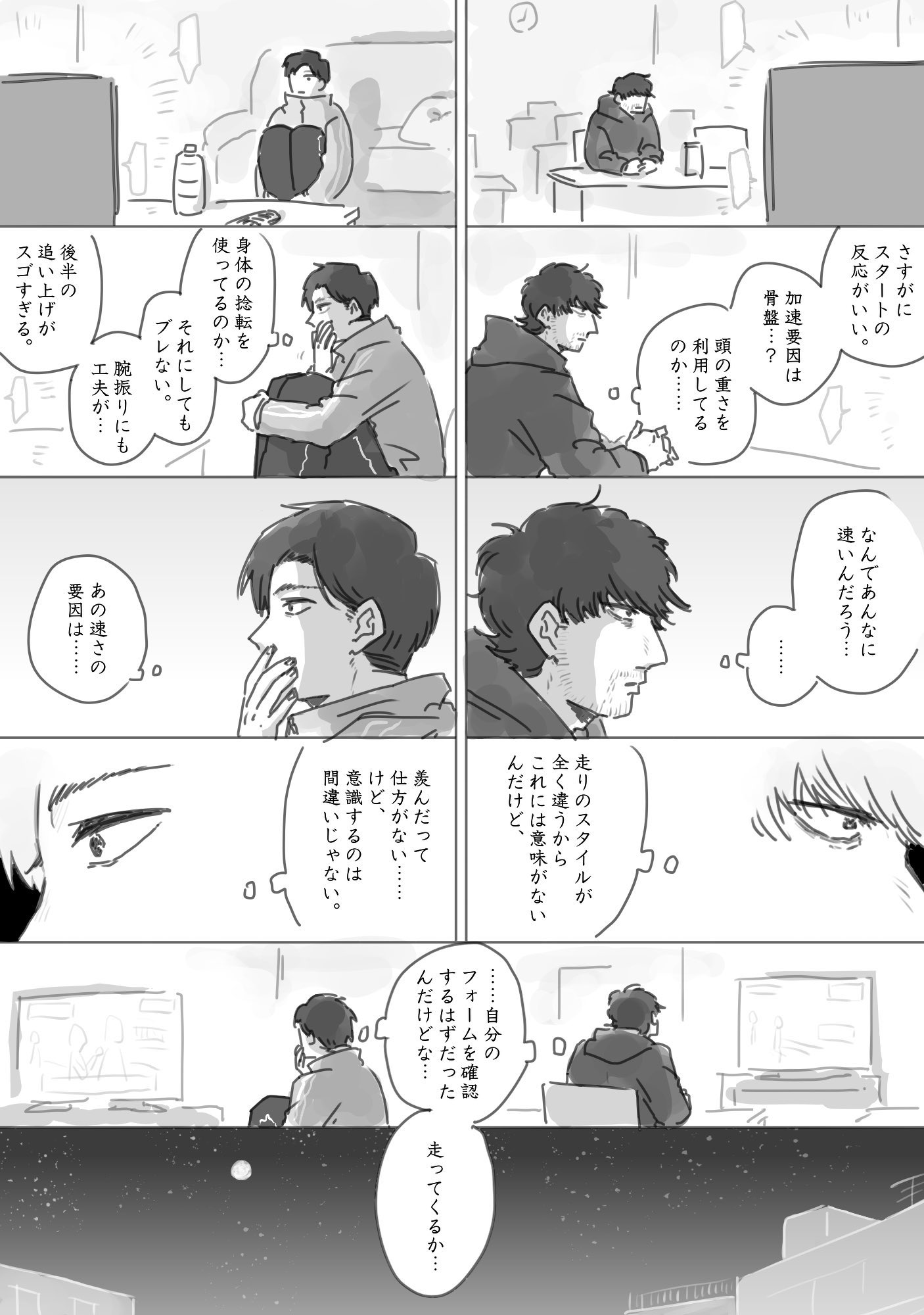 唐突補充一下「走り方変わったね」的議題,說出這句話的當下小宮心裡想的是不是「そうか、そっちに行っちゃたね。僕を置いてしまうんだね。」😢不覺得本就決心要打破日本紀錄的小宮會受動搖,但感到越發的孤獨是事實吧。教會他跑步樂趣的人,將他帶進那100公尺的距離、讓他享受短短十秒間看到的景色的人,現在已經走出這條賽道了。