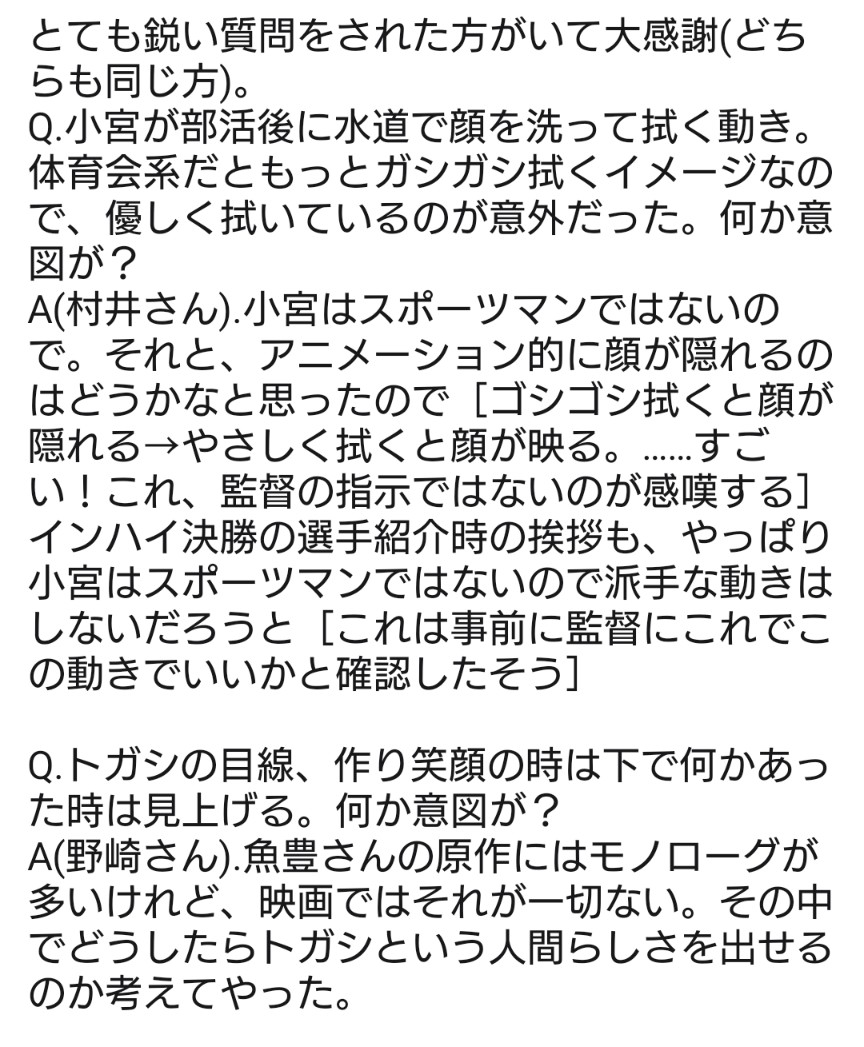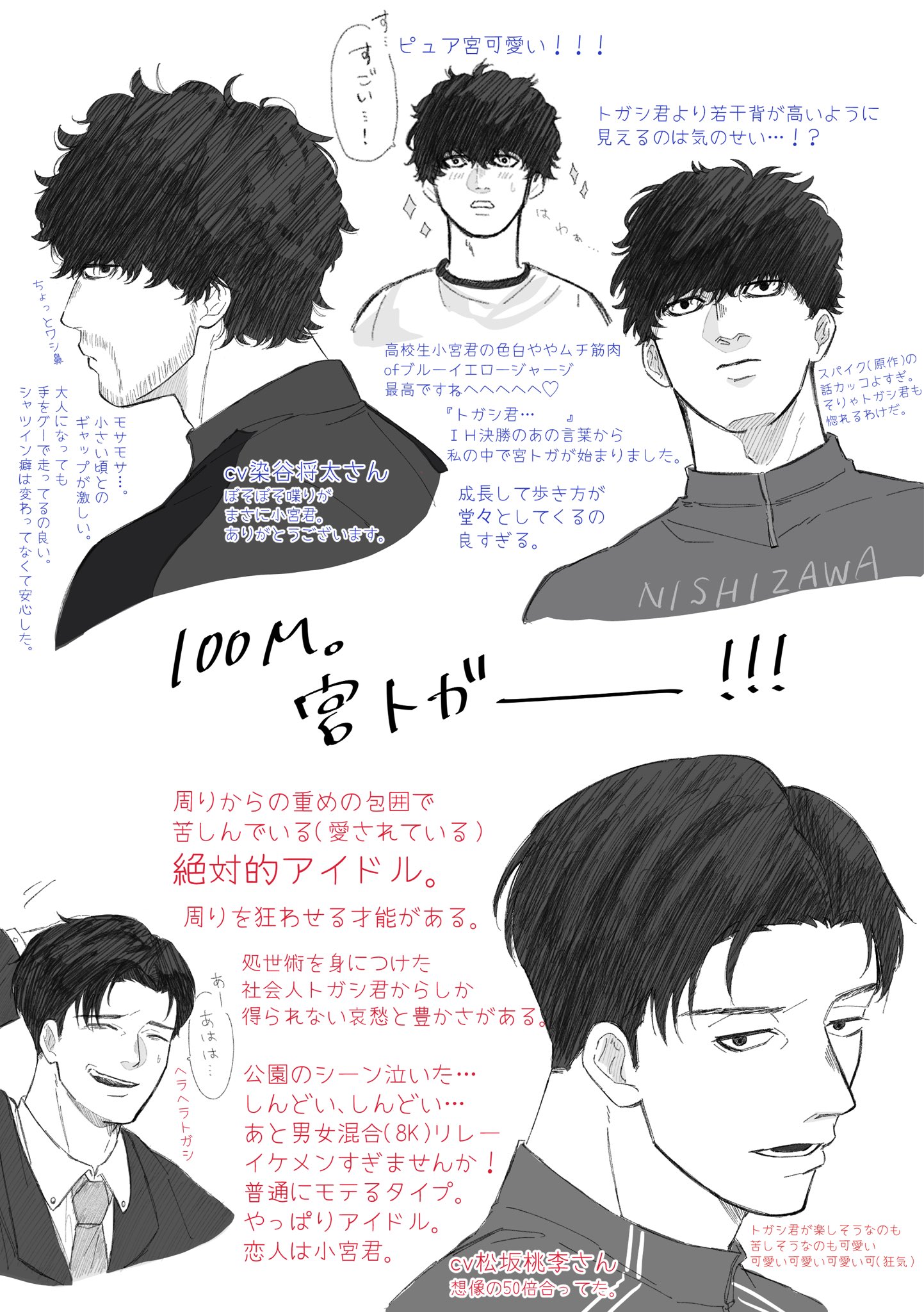 トガシ和小宮的個性跟電影裡的差很多,尤其是小宮。能看出他在奪得第一後確信自己是跑得快的,不僅喜歡上了田徑還天天想著要如何縮短紀錄,相較於只是因為「做得到」才跑步的トガシ來說,他對田徑的熱愛簡直多到滿溢而出。