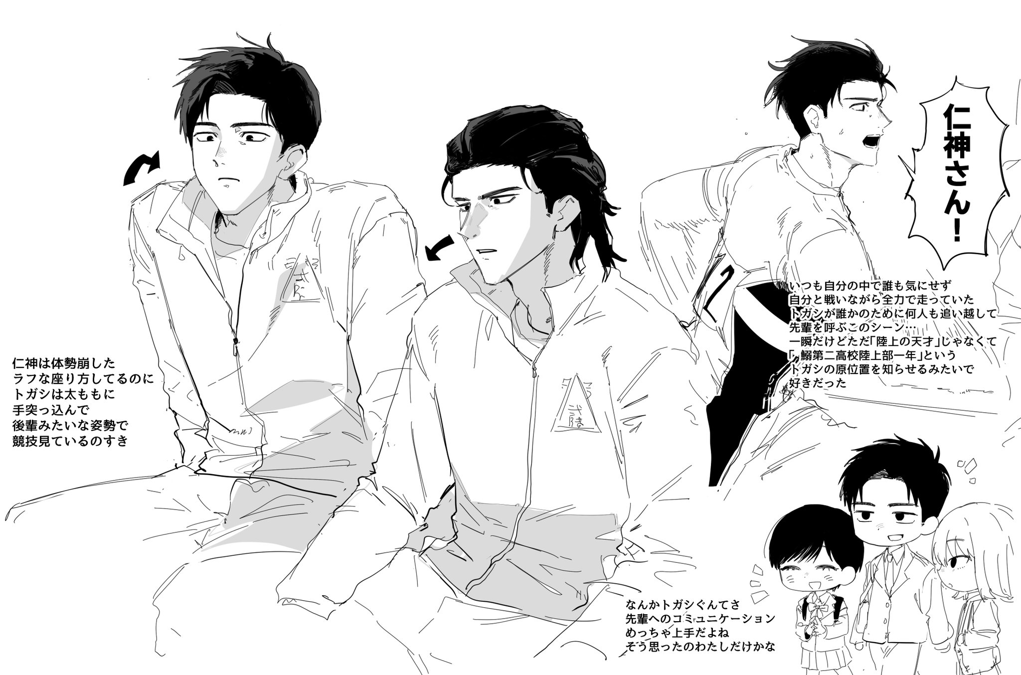 ?!之後來注意一下トガシ的坐姿,另外好喜歡太太說的「一直在內心默默和自己拉鋸的トガシ為他人奮鬥,接連超越好幾個人大喊前輩名字」讓人意識到他此時的身分不是田徑天才,而是鰯二田徑部的一年級這點