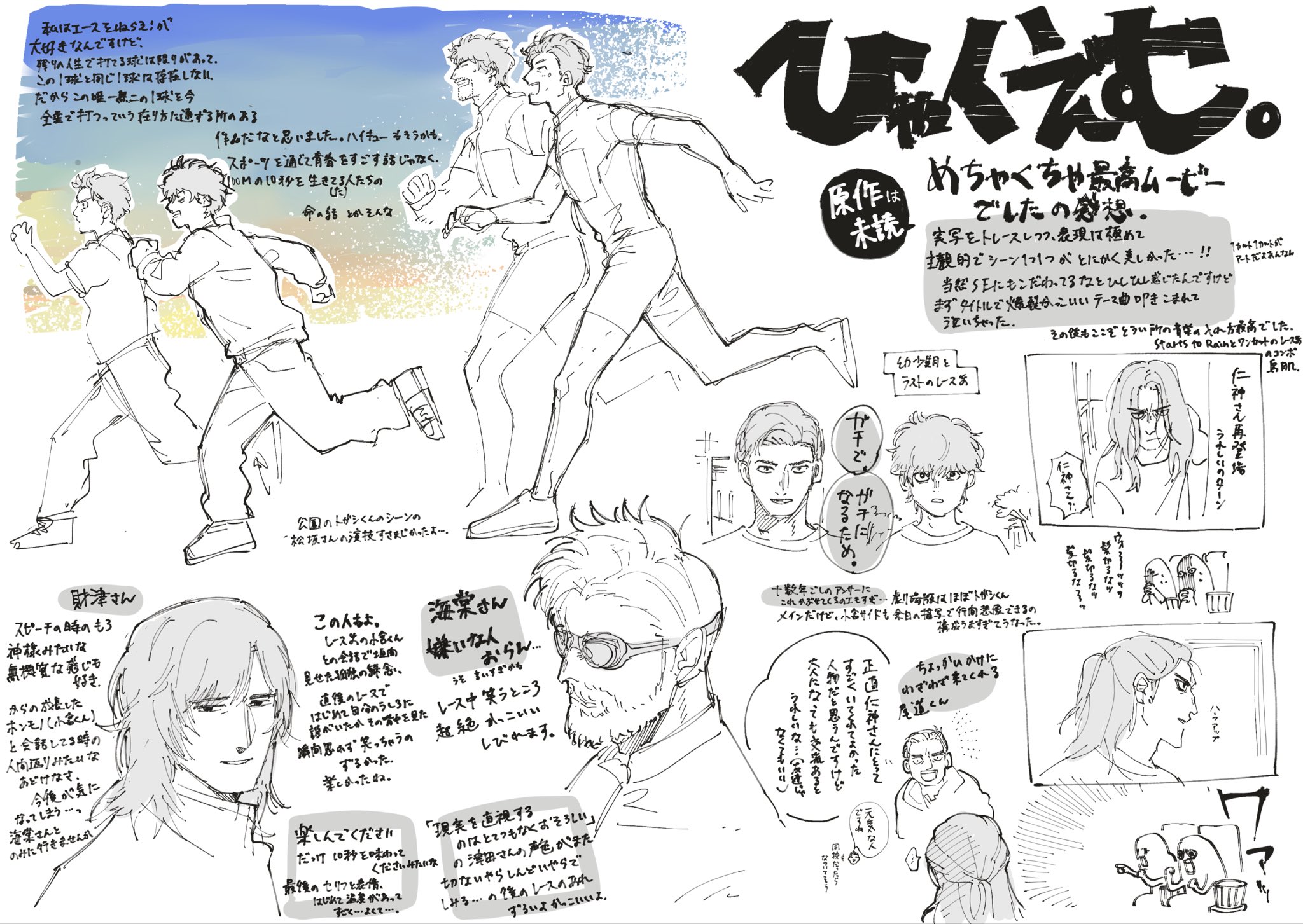 很喜歡每位角色的刻畫,其中讓我最有共鳴的就是トガシ。由於只看電影,所以我對角色們的了解都還停留在表層,不過我對トガシ的前期印象是打算依靠天生的快腿輕鬆度過人生的人。我不確定在輸給小宮前他是否都認真對待每一場比賽,可能確定的是,跑輸小宮後,他對跑步的態度明顯轉為防守,就連在給公園練習跑步的小學生建議時,他也不經意說出「比起不顧一切的決勝負,輸掉後調整心態的能力反倒更重要也說不定」。