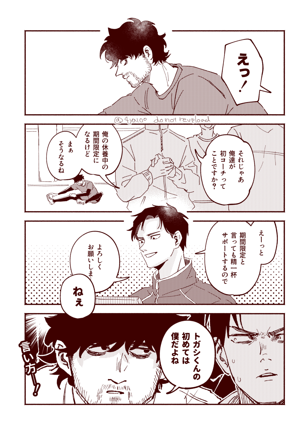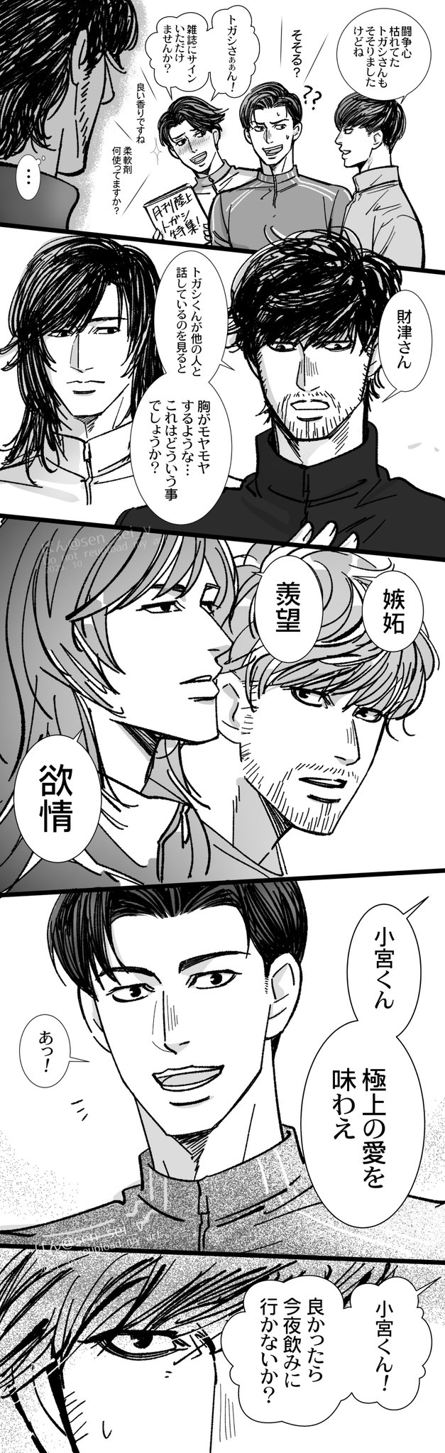 充滿了色情場面的宮トガ小段子,最喜歡的是擔心造成トガシ身體負擔,既不內射也會注意不要太粗暴的小宮vs希望對方不要顧慮那麼多,直接把體重壓上來擺腰猛幹的トガシ。