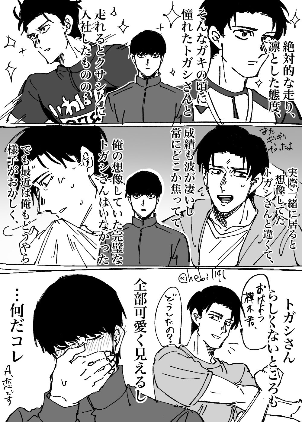 我也好喜歡被說跑步姿勢變了大受震驚的トガシ,感覺像被戳中了痛處一樣,想必他也知道自己沒有以前那麼認真面對跑步。