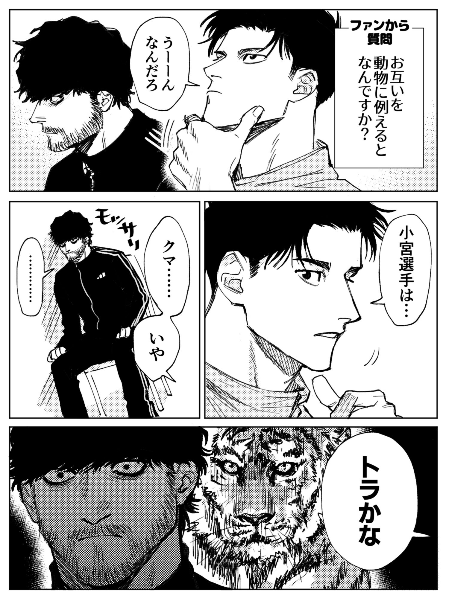 目前就我的觀察來看,トガシ的體型偏向精實,小宮的則較為厚實。尤其是脖頸、胸板還有手臂的部分,能明顯看出比トガシ大半圈。我就喜歡這樣的體型差,謝謝魚豊老師(大聲)