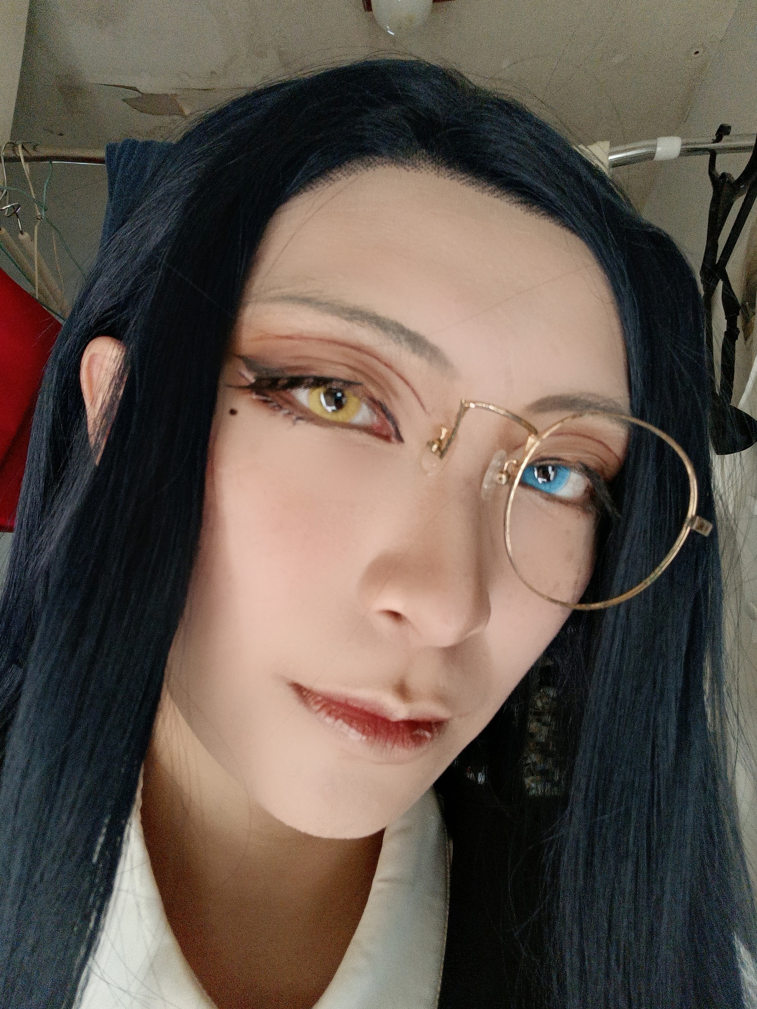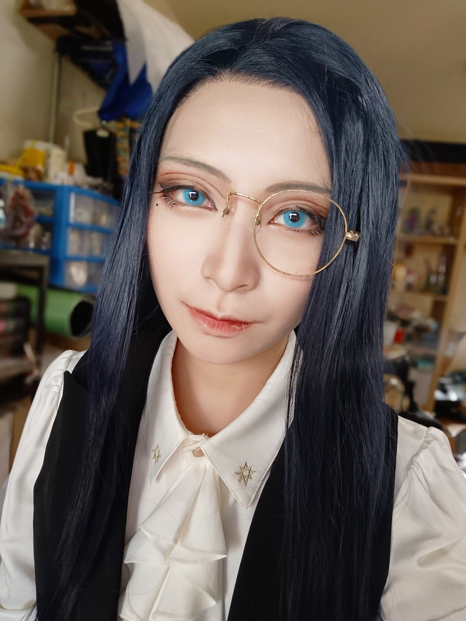 藍色水母,稍微偏綠一點點,為了凸顯高光其實有一點點暗,之前帶的紫色水晶是同系列,高光很好看,cos效果普通