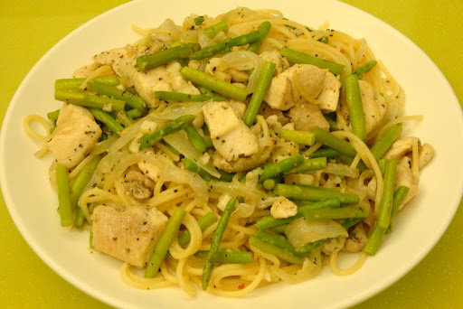 蒜香雞肉義大利麵:雞肉用了乾羅勒粉下去醃,結果味道強過蒜末,反而失了主題;雞肉味淡,應再增加蒜頭的用量和爆香時間