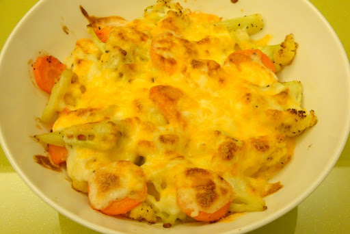 焗烤白花椰:烤箱無預熱250度烤20分鐘,起士部分味道不錯,但下頭的白醬還略有濕度,應再加烤五分鐘濃縮香氣,紅蘿蔔的甜味很迷人