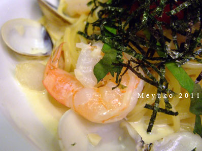 蒜香.鮮蝦. 蛤蜊.干貝.明太子 .... 最迷人的是加入了切成細條的新鮮紫蘇葉,香濃白醬有了紫蘇提味整體大加分!