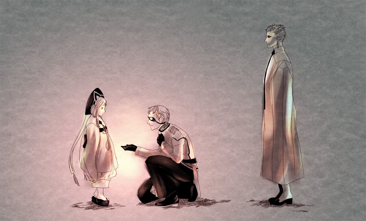 右貓最近很迷的一部作品,似乎是因為青年+幼女很萌而完全著迷了(笑)比起青年幼女,小繪覺得下屬對比自己年輕一大截的上司(或主人)畢恭畢敬唯命是從這點更萌呢。最右邊的下屬先生感覺有點像幽靈…(汗)