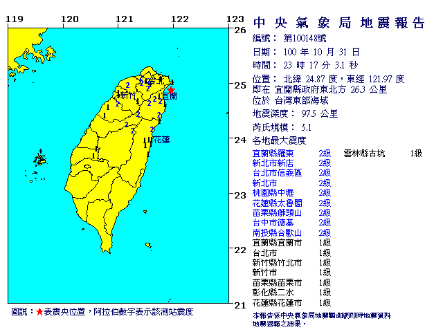 芮氏規模:5.1 震央:宜蘭縣政府東北方 26.3 公里 (位於台灣東部海域)