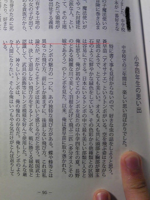 中間那句是"一直回想起國中時快樂的回憶" 但最右邊的偽標題(?)又是怎麼回事....瞄了下正文 是在敘述作者喜歡的昆蟲是蜻蜓&原由....(這不重要吧wwww