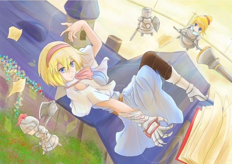 アリス・マーガトロイド,東方幻想鄉魔法森林的主客。她不是人類而是魔女,能夠操縱人偶作戰。因為不善長交友所以朋友很少,主要是魔理沙及靈夢,在二設中是個幻想鄉總受(?」By阿山。