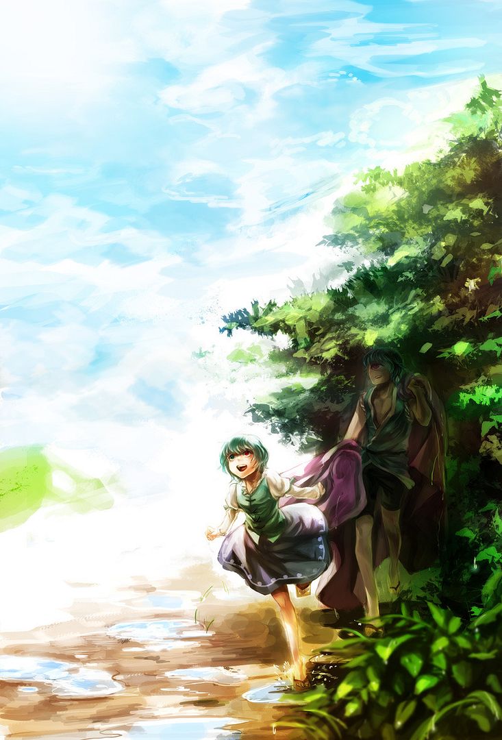正題,多多良和小傘,兩年前多多良為小傘遮雨,如今放晴了!話說陽光普照的圖比紫色調還要難控制,天然的白光不能偏某種顏色,整個畫面好混亂」By右貓。