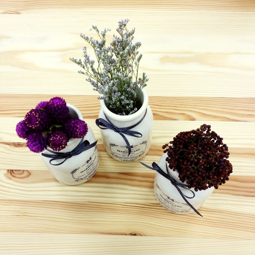 而後是千日紅、卡斯比亞,分別放入白瓷罐中,相當小巧迷人。