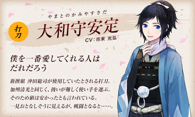 同じ沖田総司の愛刀、大和守安定とは正反対に見えて似たもの同士の喧嘩仲間。(公式サイトより)
