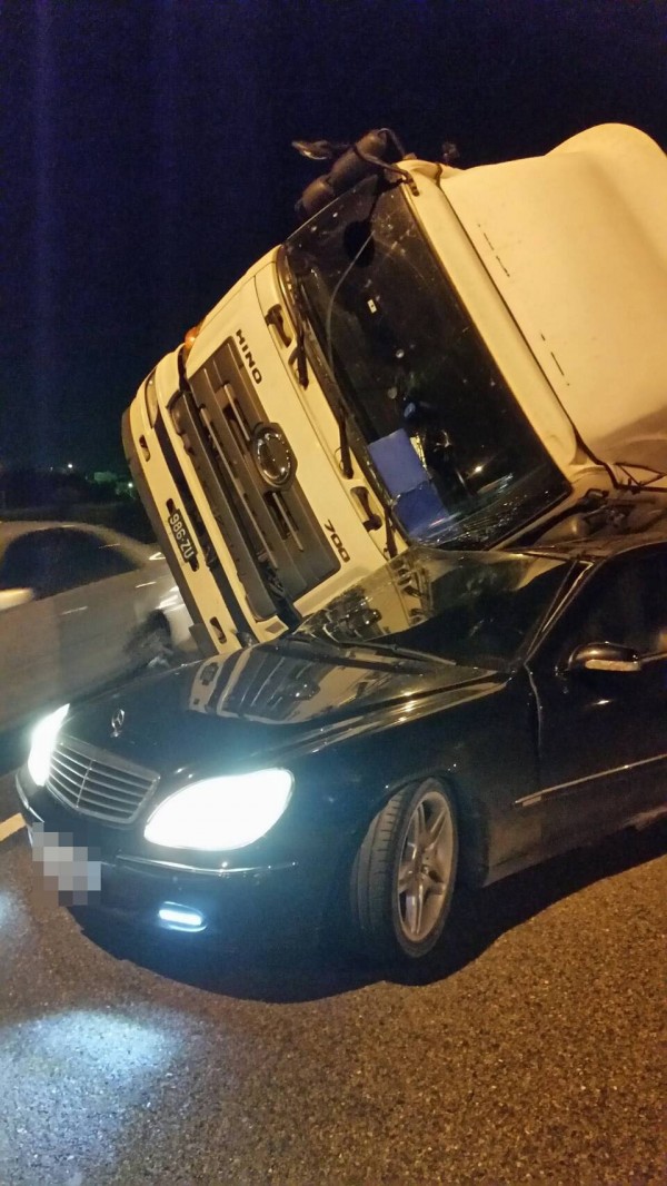 [好險]大貨車國道爆胎翻車 賓士慘遭壓扁,要不是賓士可能更慘