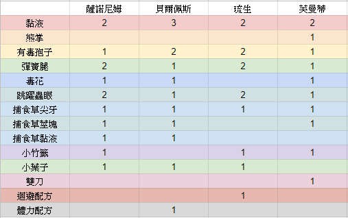 跳躍蟲眼x3/彈簧腿x3/毒花x3/黏液x9(採集成功/加成)