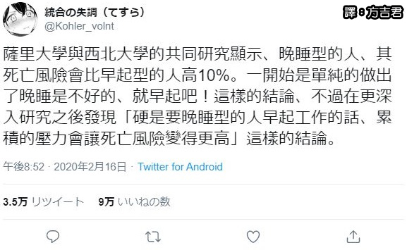 https://1.bp.blogspot.com/-V91vr3bGcqY/XsUycF7628I/AAAAAAAArT8/GLM37U9sys8sOjA1OEry0Fajp4w37EiEQCLcBGAsYHQ/s1600/FireShot%2BPro%2BScreen%2BCapture%2B%25232883%2B-%2B%2527%25282%2529%2B%25E7%25B5%25B1%25E5%2590%2588%25E3%2581%25AE%25E5%25A4%25B1%25E8%25AA%25BF%25EF%25BC%2588%25E3%2581%25A6%25E3%2581%2599%25E3%2582%2589%25EF%25BC%2589%25E3%2581%2595%25E3%2582%2593%25E3%2581%25AFTwitter%25E3%2582%2592%25E4%25BD%25BF%25E3%2581%25A3%25E3%2581%25A6%25E3%2581%2584%25E3%2581%25BE%25E3%2581%2599%2B%25E3%2580%258C%25E5%25A4%259C%25E5%259E%258B%25E4%25BA%25BA%25E9%2596%2593%25E3%2581%25AF%25E6%259C%259D%25E5%259E%258B%25E4%25BA%25BA%25E9%2596%2593%25E3%2582%2588%25E3%2582%258A%25E6%25AD%25BB%25E4%25BA%25A1%25E3%2583%25AA%25E3%2582%25B9%25E3%2582%25AF%25E3%2581%258C10%2525%25E3%2582%2582%25E9%25AB%2598%25E3%2581%2584%25E3%2580%2581%25E3%2581%25A8%25E3%2581%2584%25E3%2581%2586%25E3%2582%25B5%25E3%2583%25AA%25E3%2583%25BC%25E5%25A4%25A7%25E5%25AD%25A6%25E3%2581%25A8%25E3%2583%258E%25E3%2583%25BC%25E3%2582%25B9%25E3%2582%25A6%25E3%2582%25A7%25E3%2582%25B9%25E3%2582%25BF%25E3%2583%25B3%25E5%25A4%25A7%25E5%25AD%25A6%25E3%2581%25AE%25E5%2585%25B1%25E5%2590%258C%25E7%25A0%2594%25E7%25A9%25B6%25E3%2581%258C%25E3%2581%2582%25E3%2582%258B%25E3%2580%2582%25E5%25BD%2593%25E5%2588%259D%25E5%258D%2598%25E7%25B4%2594%25E3%2581%25AB%25E5%25A4%259C%25E5%259E%258B%25E3%2581%25AF%25E3%2581%25A0%25E3%2582%2581%25E3%2580%2581%25E6%2597%25A9_%2527%2B-%2Btwitter_com.jpg