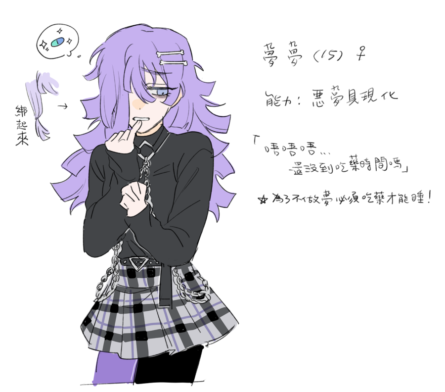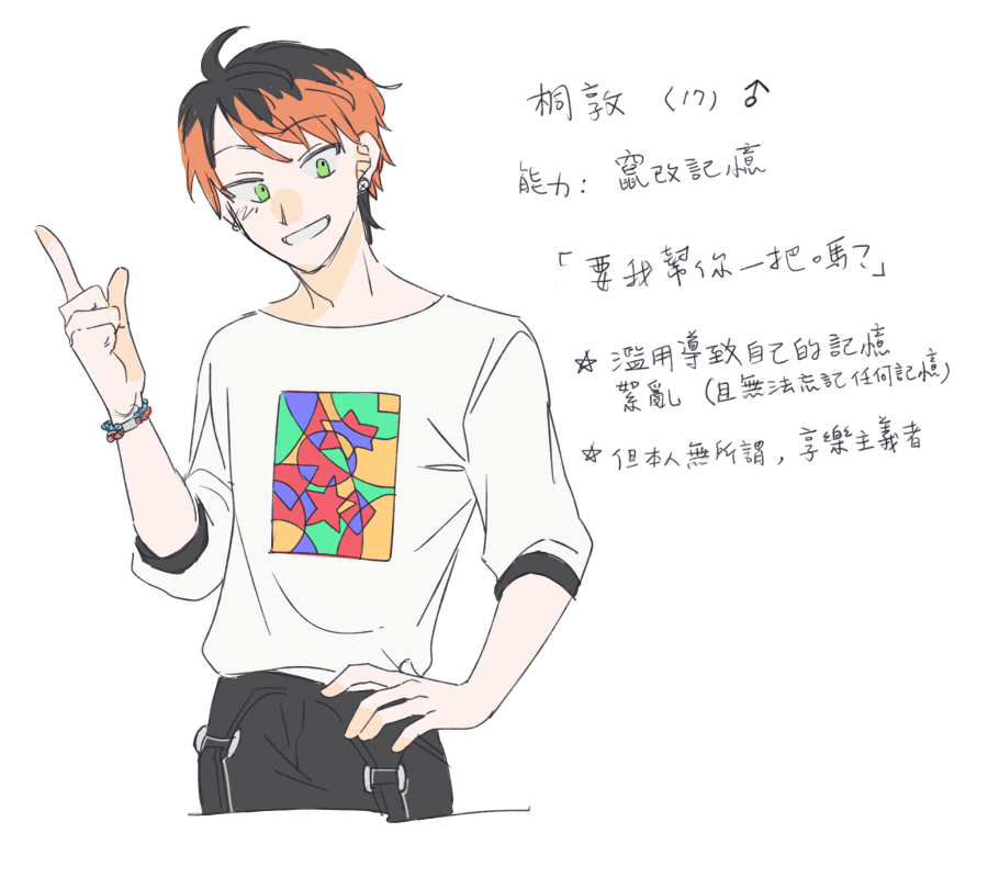 少話,其中一隻眼睛發生意外而瞎了,使用能力後會極度嗜睡,精神力會下降,除非必要不然不使用能力