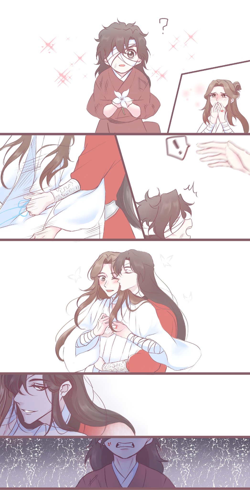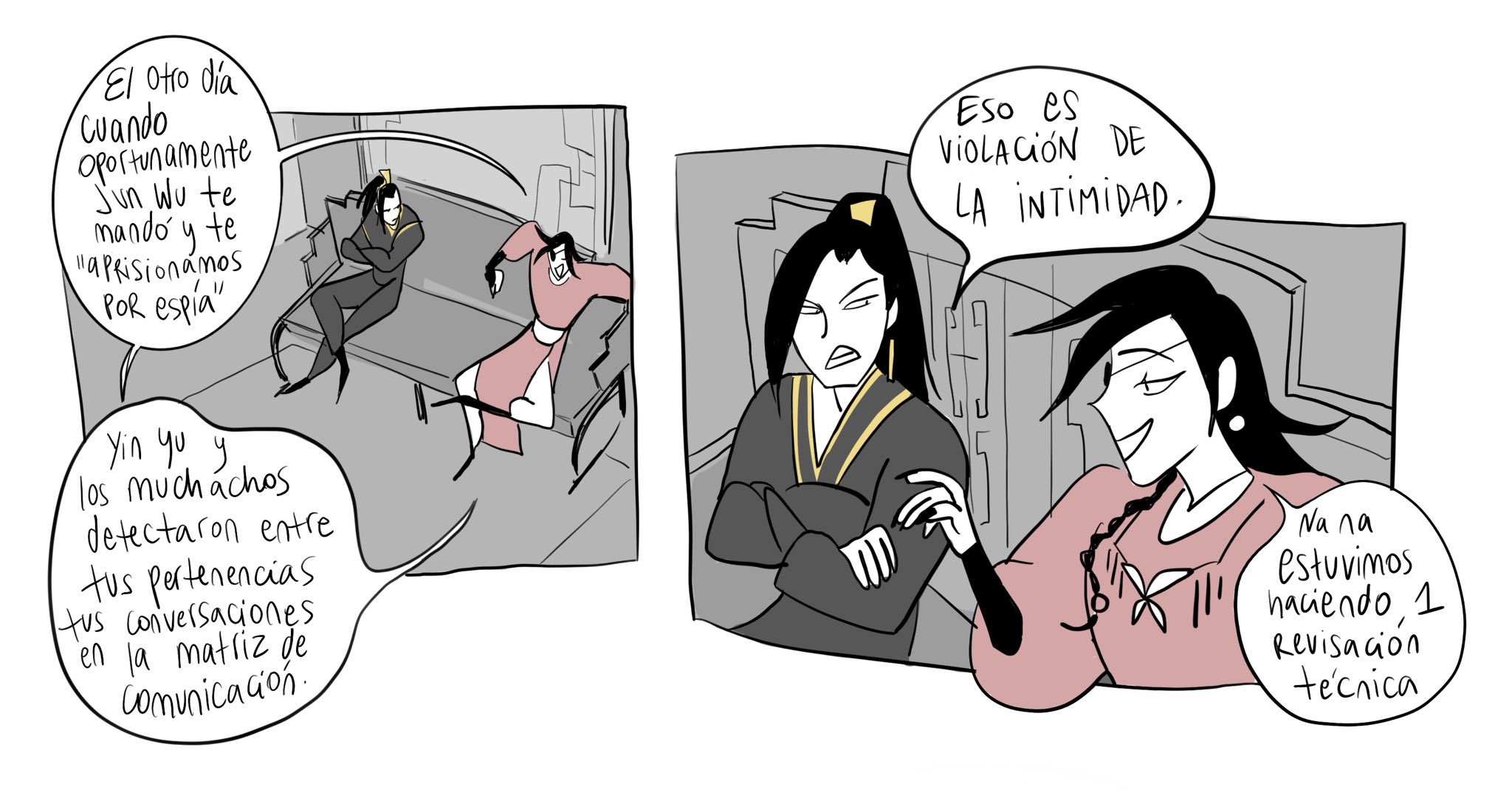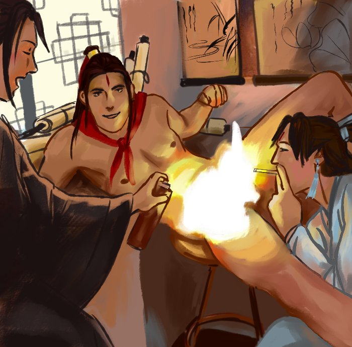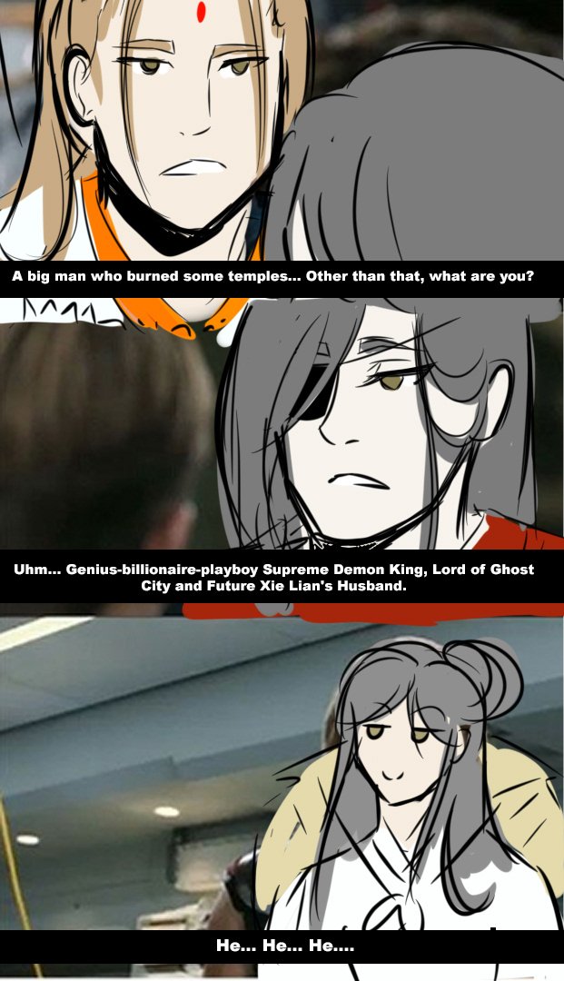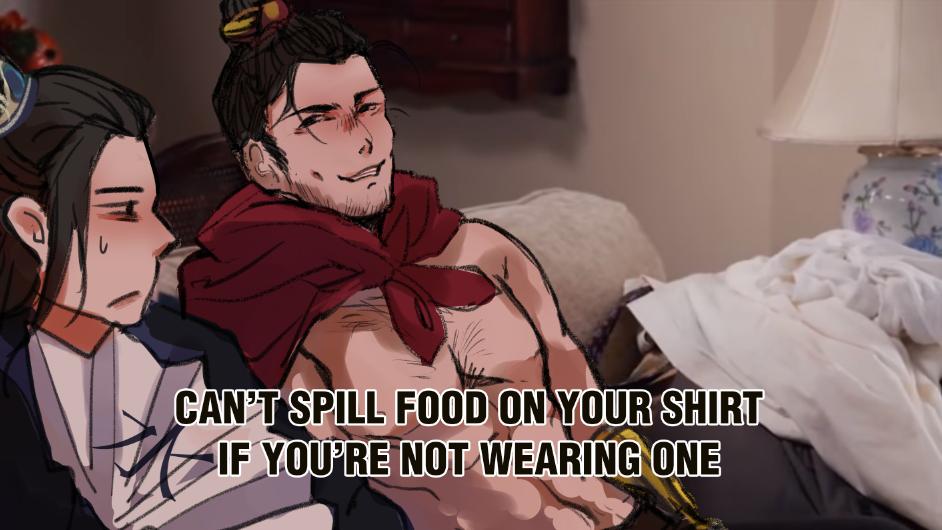 me da risa que en el manhua de hecho le cierra la camisa el fumuso y en la SIGUIENTE VIÑETA el otro se está desabrochando el botón otra vez