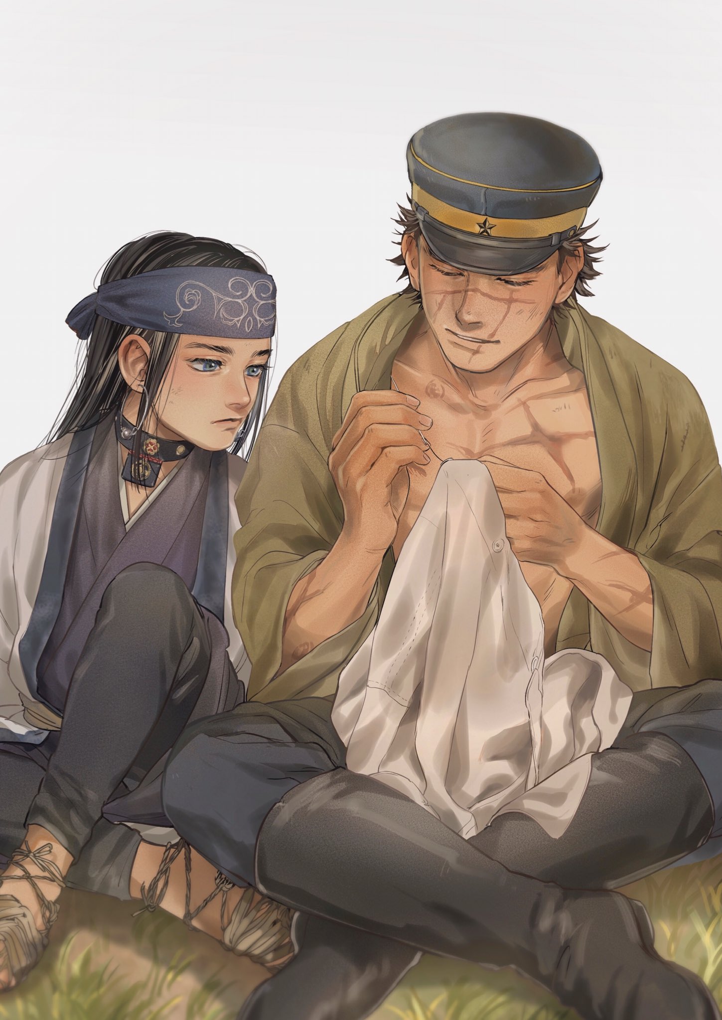 看不過白石破洞的衣服還不會縫,杉元就乾脆直接拿過來