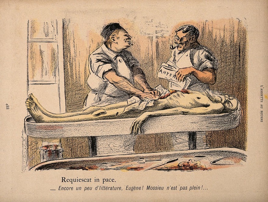 it's a French illustration reacting to news about the developing black market as medicine was starting to experiment with organ transplants