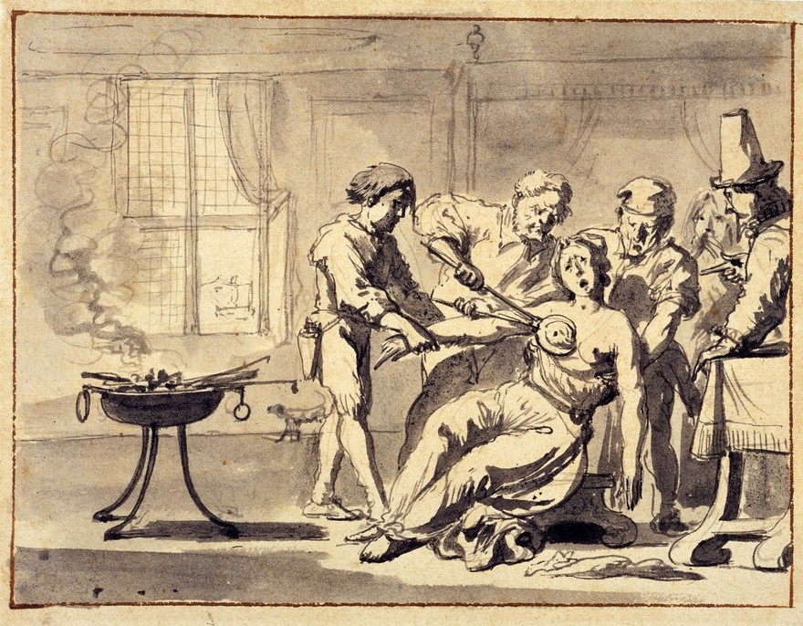 the library had it categorized as "surgeon applying a cautery iron to clearly defined points on a woman's lower abdomen (indicating the liver?). Pen drawing after a tenth century manuscript"