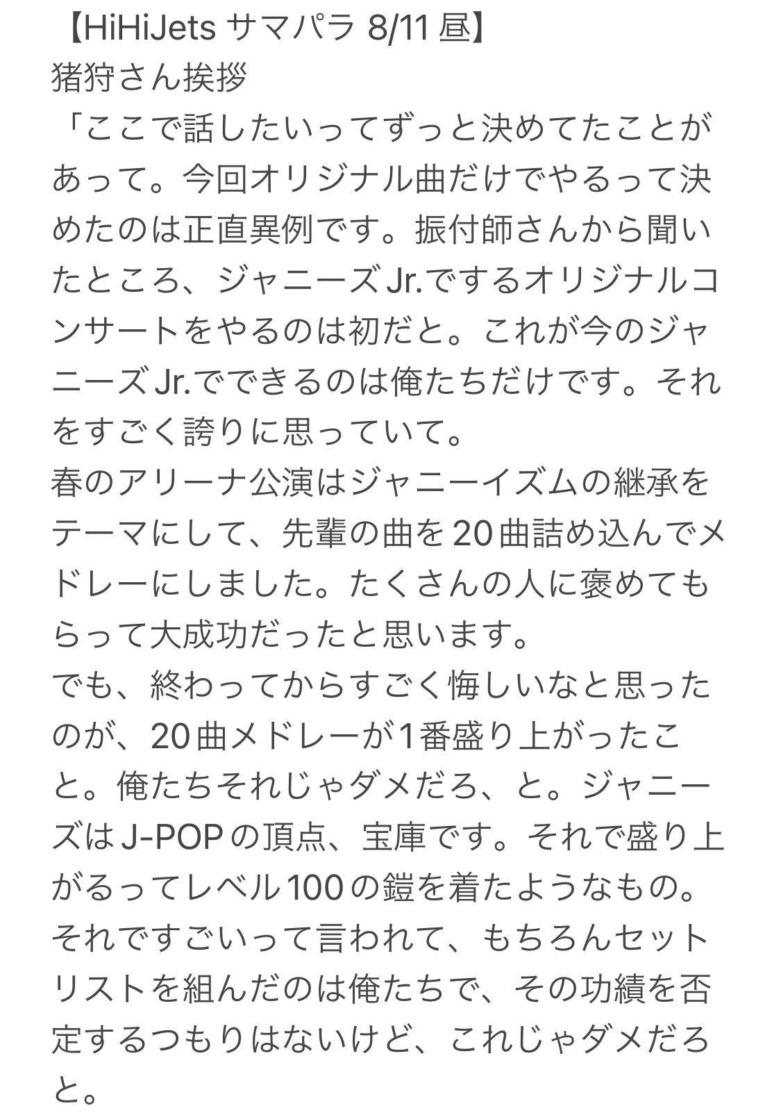 皆さんが先輩の曲をやってるのを見たいのもわかります。でも次のステップに行くためにHiHi Jetsだからできることとしてオリジナル曲でセトリを組みました。前進あるのみだと思ってます。