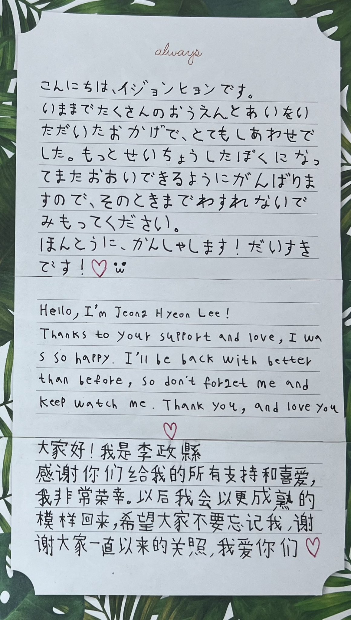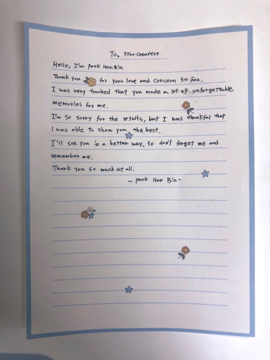 可愛的文淨泫,我們見面,朝著出道練習已經快3年了!!我們說好一定要一起出道的,還記得吧??哥哥會一直陪在我們淨泫身邊!真心祝你生日快樂!!多吃點好吃的,但個子就不要長高了,呵呵。我們淨泫以後會一直幸福。還有哥哥也會一直陪你。