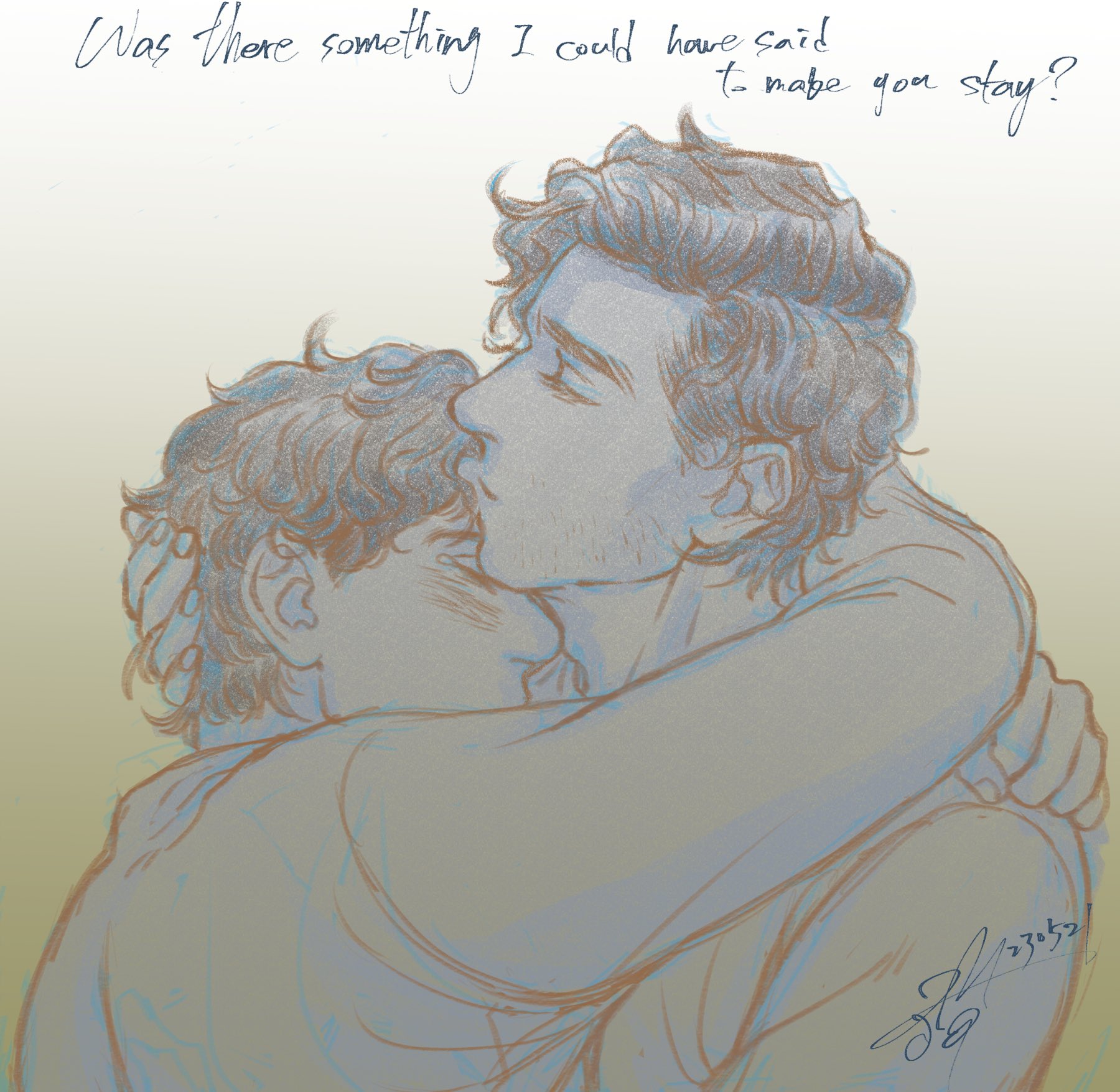 「馬克!」史蒂芬彈了起來,緊緊抱住他。他將他圈得死緊,比那時在杜埃還要用力得多。他感受到馬克按住他的後腦勺,馬克的體溫透過他的睡衣傳達了過來。是活著的,溫熱的,心臟跳動著的馬克。「你回來了。」史蒂芬的聲音埋在馬克懷裡,帶著哭腔,聽起來悶悶的。