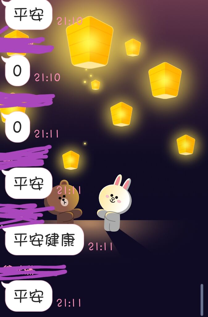 今天打"平安"兩字,或平安健康四個字,背景會出現熊大放天燈喔!!只有手機才看的到!!願大家牛年一整年裡都能平安健康