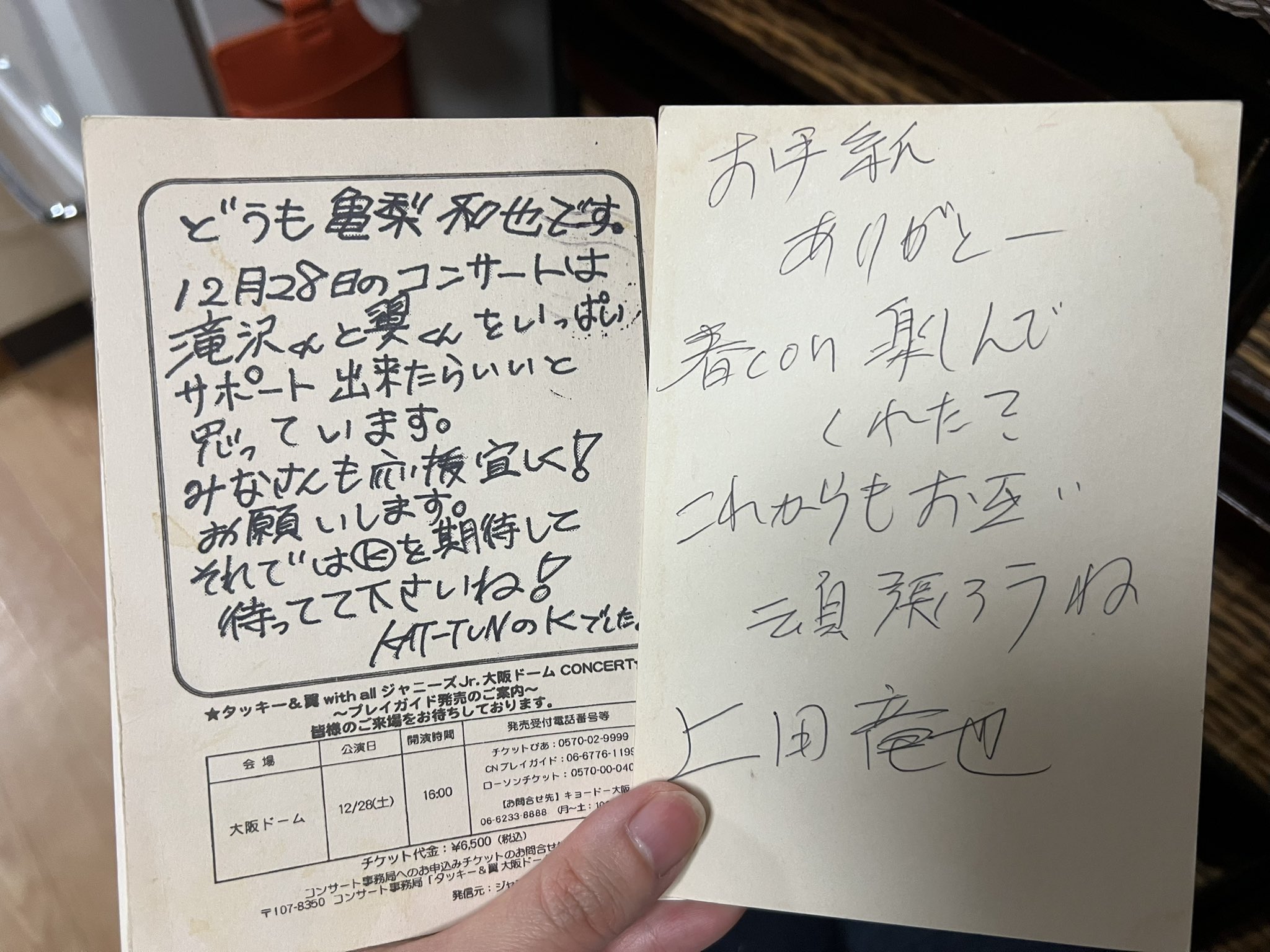 部屋を掃除してたらKATーTUNになったばかりの亀梨和也と上田竜也のファンレターの返事の手紙が出てきた。嬉しかったなぁ