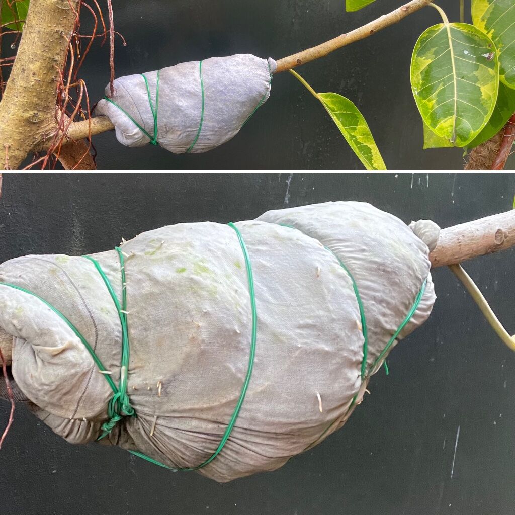 Sawed off and potted two branches I marcotted from my variegated rubber tree two months ago. Most of the leaves are trimmed off to reduce water demand. The bigger of the two little trees is already reserved for someone. Let’s hope they survive