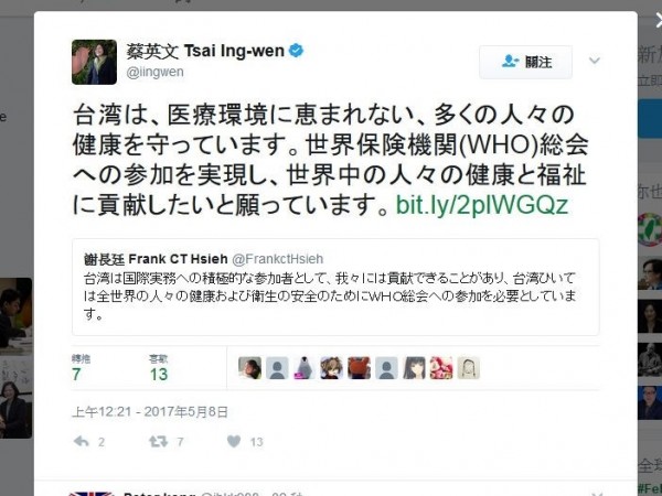 WHA倒數 蔡英文10度推特發文 - 政治 - 自由時報電子報世界保險機關?????我還以為日文是「世界保健機關」呢,果然官大學問大